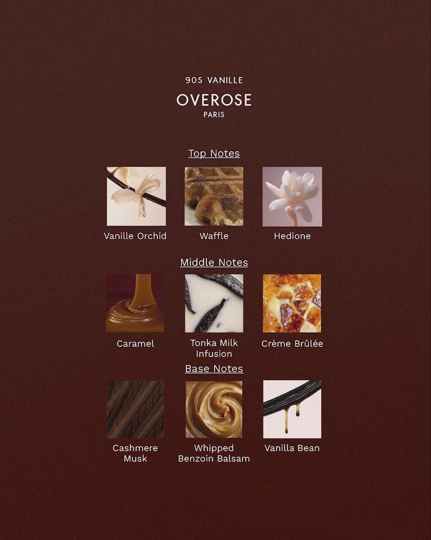 We enriched natural vanilla extract with notes of caramel and a warm milk infusion, creating the sensation of crème brûlée melting on skin. At the base, cashmere musk and whipped benzoin balsam wrap the composition in softness and depth, adding richness without weight. A fragrance that’s indulgent, intimate, and effortlessly iconic. Like the 90s itself.